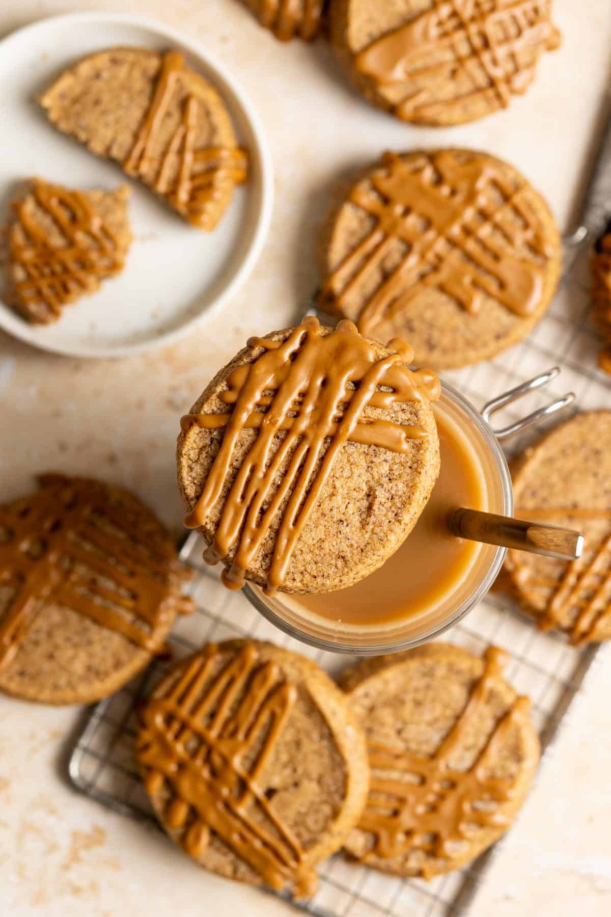 - Glaze the cookies – Transfer the glaze to a piping bag or a ziploc back and snip the corner to create a small opening. Drizzle coffee glaze on top of the cooled cookies. Let the glaze dry completely before storage.